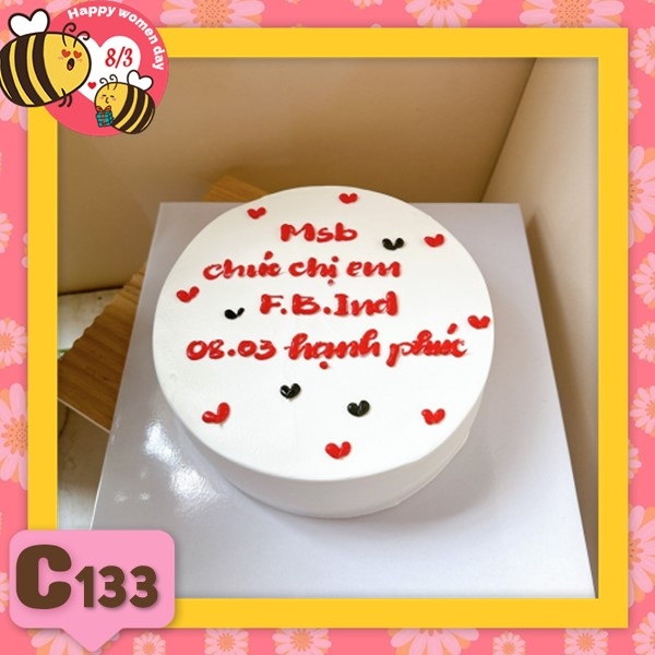 Trên mặt bánh, tiệm sẽ viết thông điệp "Msb chúc chị em F.B.Ind 08.03 hạnh phúc" bằng kem tươi màu đỏ. Đây là lời chúc chân thành, thể hiện sự quan tâm và yêu thương của bạn dành cho những người phụ nữ quan trọng trong cuộc đời.