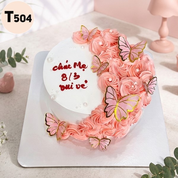 Mẫu T504 gây ấn tượng mạnh với cách bố trí hoa kem bơ tập trung ở một bên bánh, tạo hình như vầng trăng khuyết đầy quyến rũ. Những bông hoa hồng màu hồng phấn được bắt cực kỳ sắc nét, mỗi cánh hoa đều toát lên sự tỉ mỉ của người thợ.