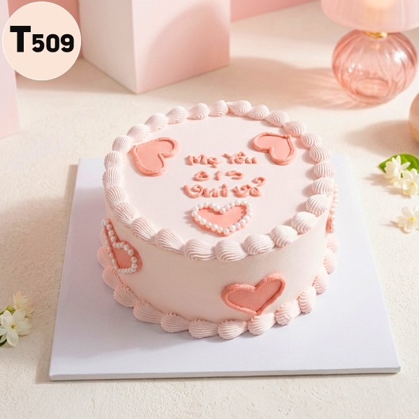 Mẫu bánh T509 được bao phủ bởi lớp kem màu hồng pastel cực kỳ dịu mắt. Điểm nhấn là những hình trái tim được vẽ nổi 3D xung quanh thân và mặt bánh, tạo cảm giác như những viên kẹo ngọt ngào.