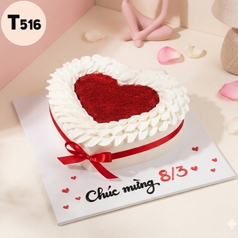 Sản phẩm T516 gây ấn tượng mạnh với tâm trái tim được phủ lớp bột nhung đỏ thẫm mịn màng. Bao quanh là lớp kem trắng được bắt tạo hình lông vũ/cánh hoa mềm mại, tạo hiệu ứng thị giác cực kỳ sang trọng và bồng bềnh.
