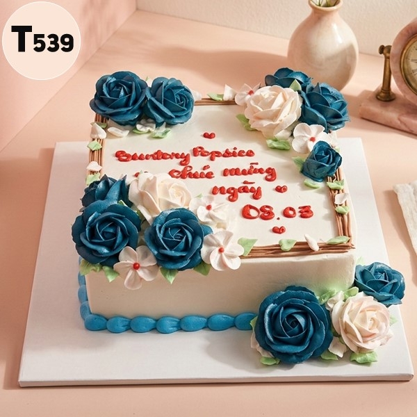 Bánh kem vuông Quốc tế Phụ nữ 8/3 - T539 nổi bật với những đóa hồng xanh đậm mang vẻ đẹp huyền bí, quý tộc và sự tin tưởng tuyệt đối. Nếu công ty muốn tìm một mẫu bánh độc đáo, khác biệt hoàn toàn với sắc hồng truyền thống để tặng đối tác nữ VIP, thì T539 chính là sự lựa chọn số 1. Liên hệ tiệm ngay để được tư vấn vị bánh ưng ý!