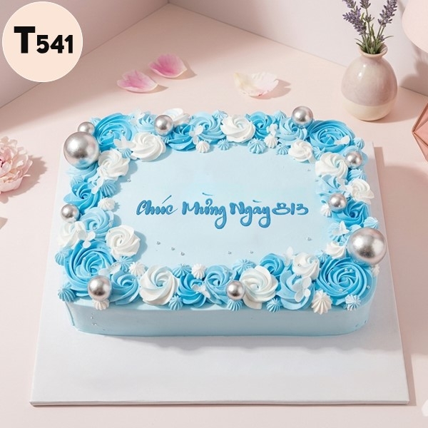 Mẫu bánh dáng vuông rộng rãi, nổi bật với viền hoa hồng kem được bắt tỉ mỉ xen kẽ giữa hai tông màu xanh dương và trắng tinh khôi. Những đóa hoa này tượng trưng cho tình cảm chân thành và sự trân trọng tuyệt đối dành cho người nhận.